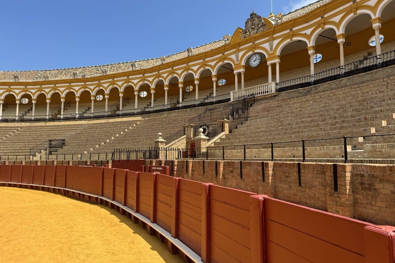 The Plaza de Toros in Seville has open bleacher seating divided into sections (gradas) and covered booth areas (tendidos). VIPs sit in the lower booths or private balcony boxes.